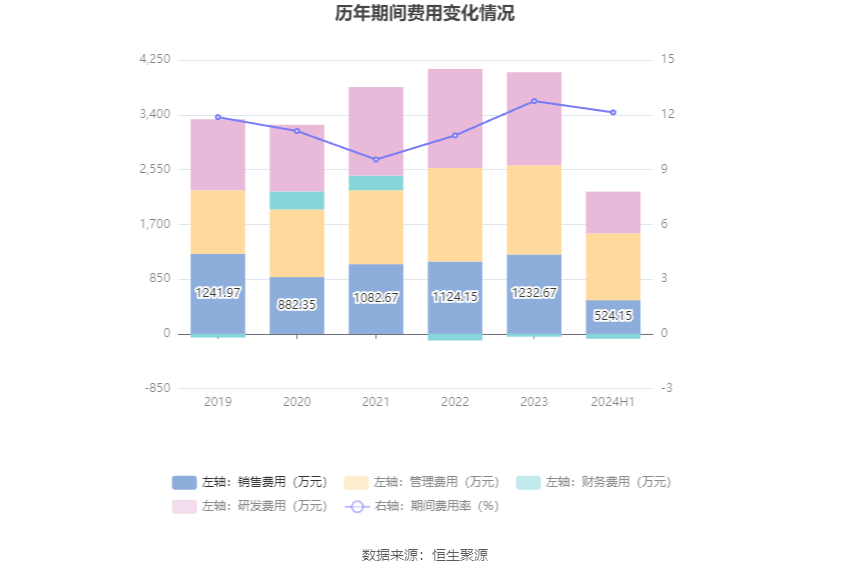 2024年上半年,公司期间费用为2132.17万元,较上年同期增加400.87万元;期间费用率为12.13%,较上年同期上升1.46个百分点。其中,销售费用同比下降4.57%,管理费用同比增长47.26%,研发费用同比增长12.03%,财务费用由去年同期的-99.71万元变为-75.85万元。
