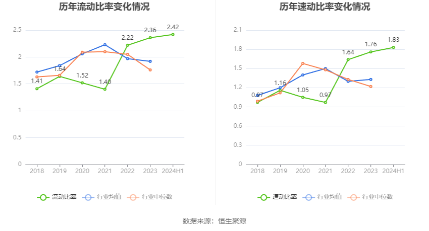 2024年上半年,公司流动比率为2.42,速动比率为1.83。