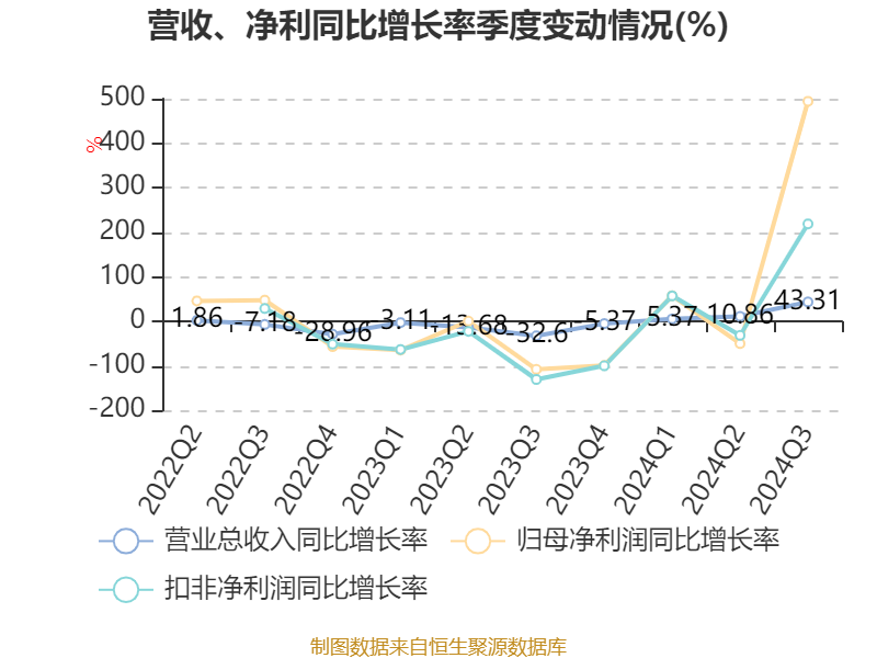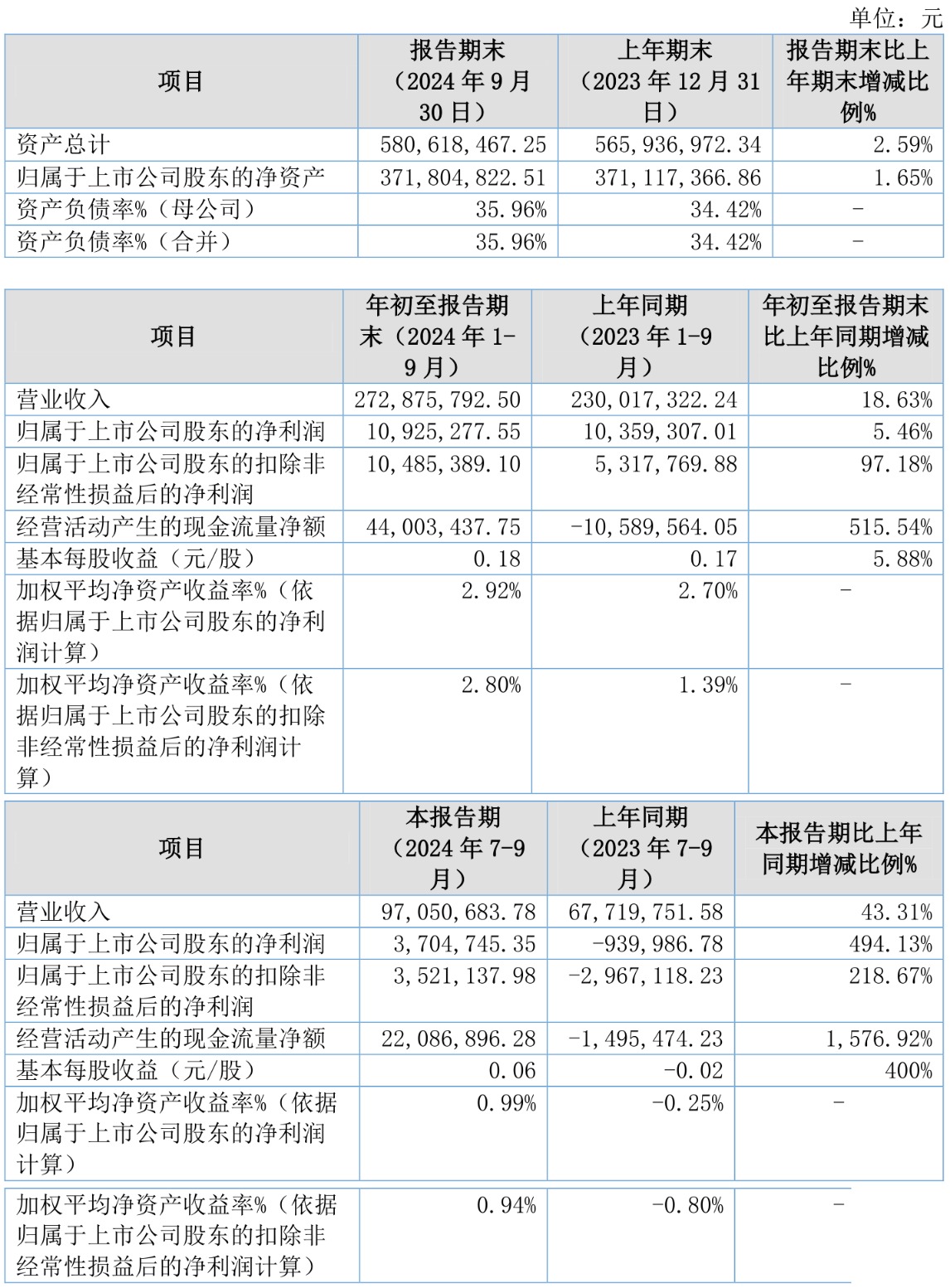 2024年前三季度,公司经营活动现金流净额为4400.34万元,同比增加5459.3万元;筹资活动现金流净额-1502.49万元,同比增加855.16万元;投资活动现金流净额-2086.91万元,上年同期为-1036.88万元。