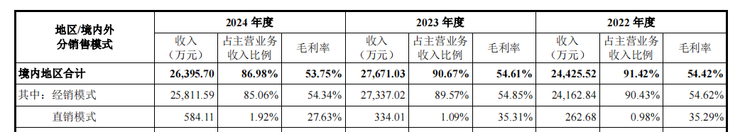 海圣医疗的销售模式以经销为主,近年来经销收入占比在85%以上。2022年至2024年,公司经销模式的收入分别为2.42亿元、2.73亿元、2.58亿元,占比分别为90.43%、89.57%、85.06%。