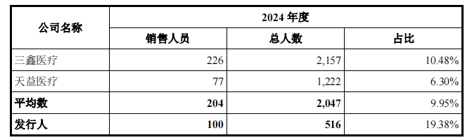 2024年,海圣医疗的销售人员为100人,占公司总人数的19.38%。相比之下,可比公司平均销售人员数量为204人,平均占比为9.95%,约为海圣医疗的一半。