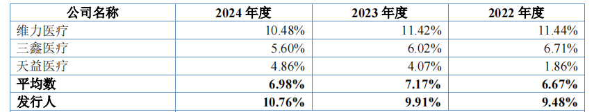 根据申请文件,海圣医疗各期销售费用率分别为9.48%、9.91%和10.76%,高于可比公司平均水平。2022年至2024年,行业可比公司的销售费用率均值分别为6.67%、7.17%、6.98%,远低于海圣医疗。
