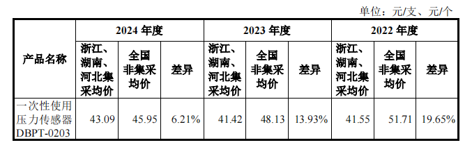 集采带来的价格压力已经显现。以一次性使用压力传感器DBPT-0203为例,该产品2022年至2024年的集采均价分别为41.55元、41.42元、43.09元,较非集采均价低6%至20%。
