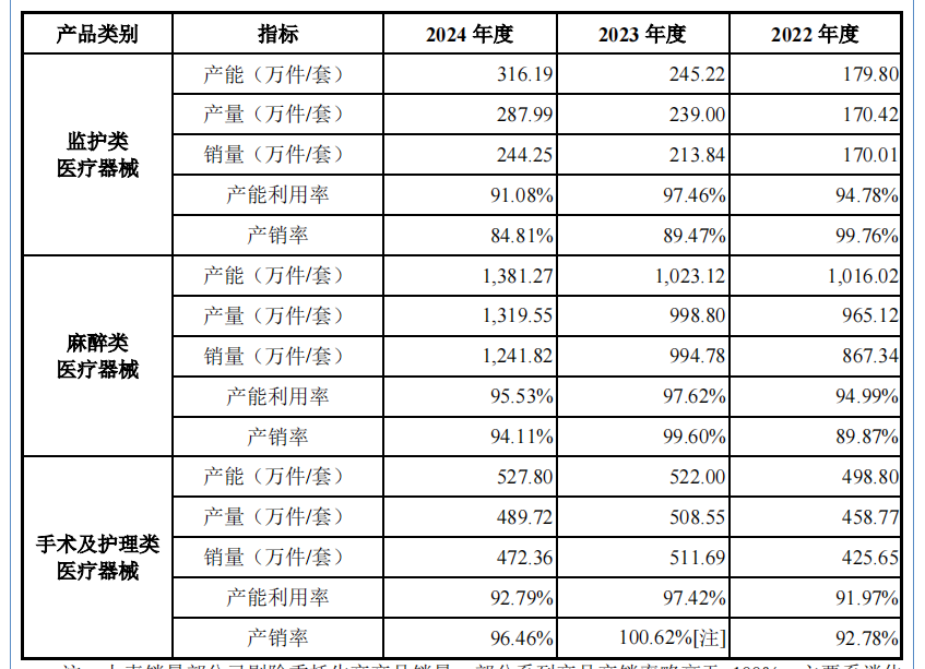 但产能利用率的下滑让人对募投项目的合理性产生疑问。2024年,公司主营监护类、麻醉类、手术及护理类医疗器械产能利用率、产销率均存在下滑情形。