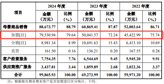 报告期内,公司来自加盟商的母婴商品销售收入分别为4.54亿元、5亿元和7.95亿元,占主营业务收入的比例分别为75.74%、72.24%和79.64%。