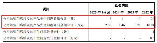 问询回复显示,报告期各期及2025年上半年,孕婴世界加盟门店涉及的产品安全问题数量分别为22条、17条、11条、7条,三年半合计57条,合计罚超18万元。值得一提的是,今年上半年被处罚金额已超去年全年。