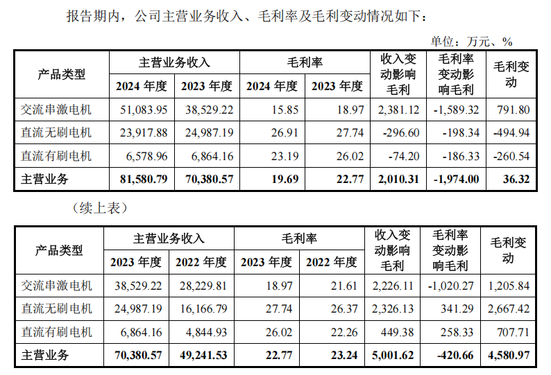 《财中社》注意到,晨光电机的财务数据呈现出“高速增长与盈利压力并存”的局面。2022-2024年,公司主营业务收入由4.92亿元快速增长至8.26亿元,三年复合增速达到28.7%。不过,与收入扩张相伴的却是盈利能力的明显波动。2024年,公司归母净利润同比下降20.84%,综合毛利率则由2022年的23.23%降至2024年的19.73%。