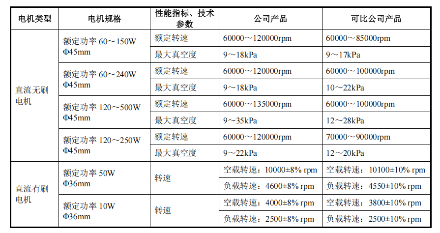 从性能对比看,公司代表性产品在最大吸入功率、效率、真空度等关键指标上部分优于可比厂商,显示一定优势。例如,额定功率1000WΦ106mm的交流串激电机最大效率达到38.6%,高于部分同行。但同时在风量、真空度等参数上,公司产品也存在与对手互有高低的情况,这意味着其竞争优势更多体现在综合性能与稳定交付能力,而非单一指标的绝对领先。