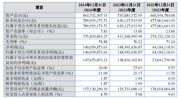2022-2024年(报告期),贝尔生物营业收入分别为2.75亿元、4.13亿元、3.76亿元,归母净利润分别为4418万元、1.49亿元、1.40亿元。
