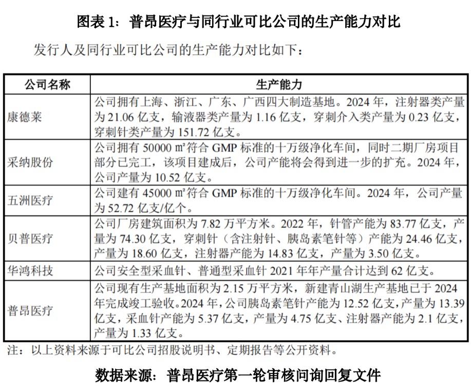 需注意的是,第一轮审核问询回复文件中所列示的与同行业可比公司的生产能力对比数据显示,贝普医疗在2022年就拥有83.77亿支针管产能,含胰岛素笔针在内的穿刺针产能则为24.46亿支,注射器产能为14.83亿支,并且在2022年上述产能分别实现了产量74.30亿支、18.60亿支、3.50亿支。