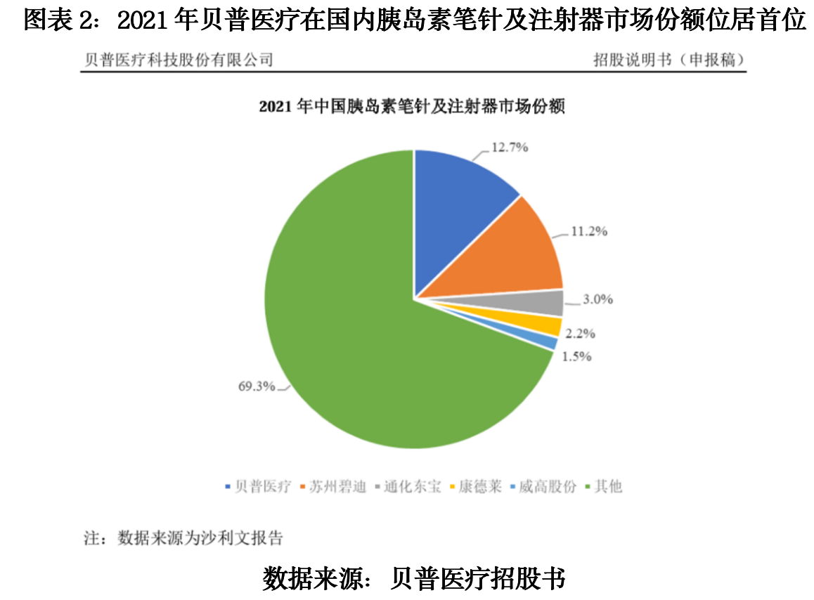 事实上,同行企业贝普医疗曾于2022年申报创业板IPO,在历经两轮审核问询后,于2023年8月撤回了申请材料。贝普医疗曾在招股书中表示,根据弗若斯特沙利文研究数据,2021年贝普医疗胰岛素注射相关产品(含胰岛素笔针、胰岛素注射器)在国内市场占有率为12.7%,居行业首位。