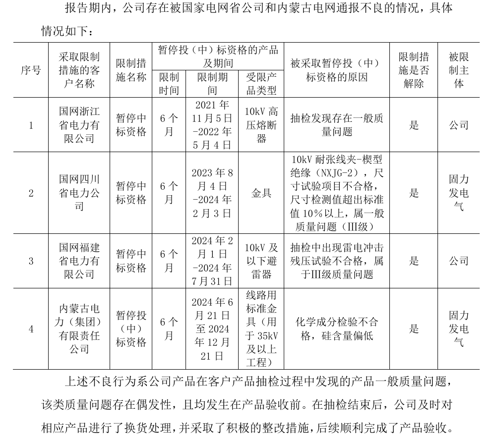 然而,研读12月31日披露的《审核问询函回复》第184页及相关附件可以发现,报告期内固力发在浙江、四川、福建、内蒙古等多个核心省级辖区内,多次因产品质量问题收到电网公司的违规通报,呈现出质量管控层面的连续挑战。