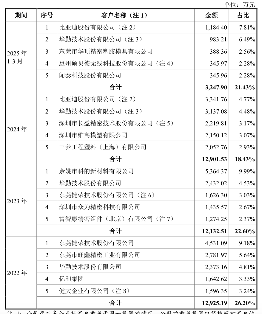 公司同时说明,存在多个直接客户同属于一个大型集团的情况,因此在披露时已按集团合并口径统计销售收入。例如,2025年一季度的第一大客户比亚迪,其销售额便包含了比亚迪供应链管理公司、比亚迪汽车工业公司及其关联方的总和。