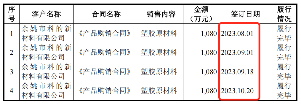 通过天眼查进一步查询余姚市的这家公司信息,界面新闻发现,该公司成立于2021年5月,注册资本仅为50万元。这意味着,在公司成立仅一年半之后,它便一跃成为中塑股份的第一大客户,而2023年恰好是中塑股份启动上市辅导的年份。根据披露,自2023年6月开始与中塑股份发生业务往来后,余姚市的这家公司在随后短短三个月内(2023年6月至10月),便接连下达了多笔大额订单,锁定了超过4000万元的销售金额。