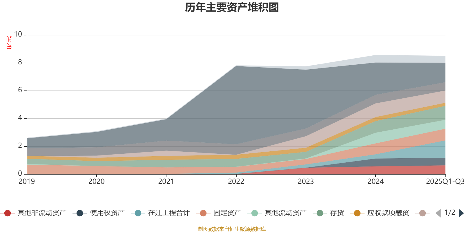 资产重大变化方面,截至2025年三季度末,公司在建工程合计较上年末增加311.89%,占公司总资产比重上升11.25个百分点;货币资金较上年末减少39.71%,占公司总资产比重下降10.64个百分点;存货较上年末增加20.39%,占公司总资产比重上升2.08个百分点;其他流动资产较上年末减少16.37%,占公司总资产比重下降1.42个百分点。