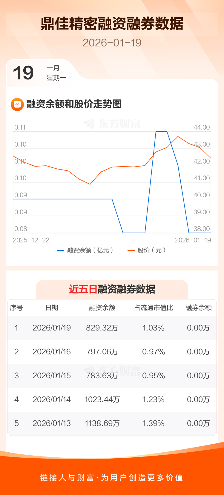 交易所最新数据显示,鼎佳精密于2026年1月19日获融资买入44.09万元,融资偿还11.83万元,当日融资净买入32.26万元。目前,该股融资余额829.32万,占流通市值比例为1.03%。