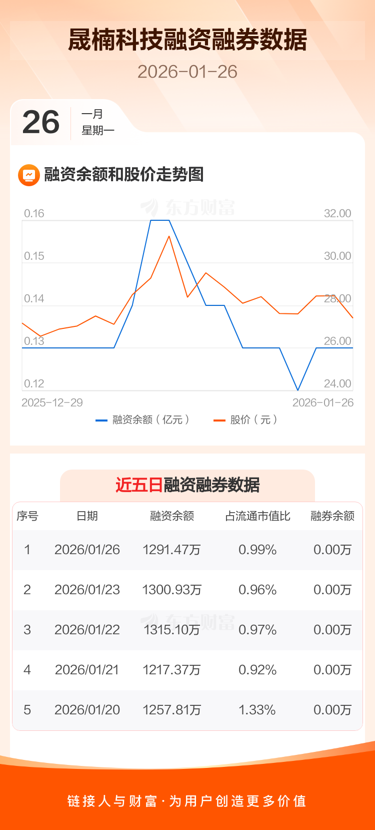 交易所最新数据显示,晟楠科技于2026年1月26日获融资买入61.34万元,融资偿还70.81万元,当日融资净偿还9.46万元。目前,该股融资余额1291.47万,占流通市值比例为0.99%。