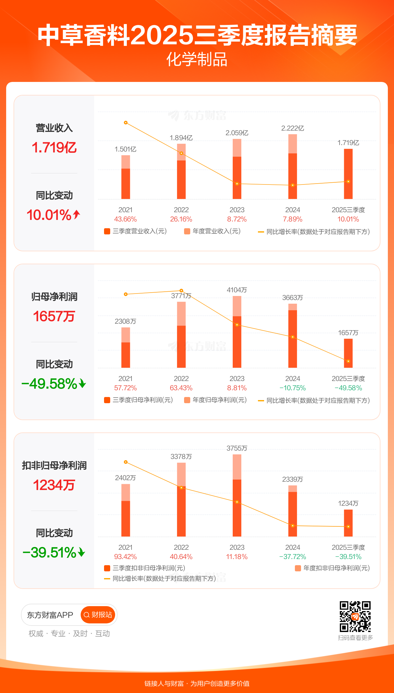 中草香料10月28日发布2025年三季报显示,公司前三季实现营业收入1.72亿元,同比增长10.01%;归母净利润1657.35万元,同比下滑49.58%;扣非归母净利润1233.55万元,同比下滑39.51%。