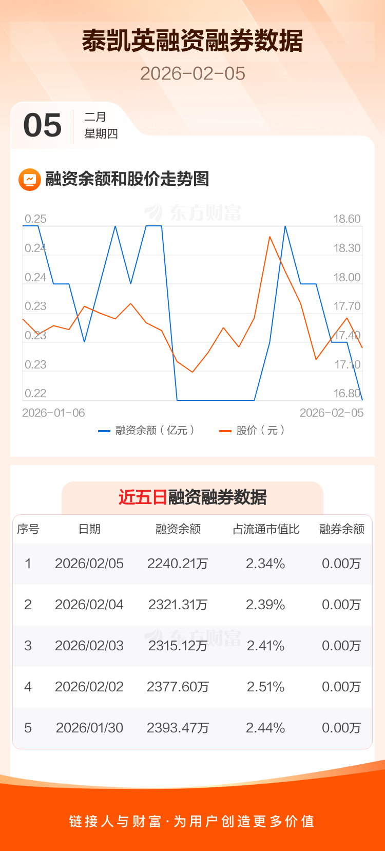 交易所最新数据显示,泰凯英于2026年2月5日获融资买入71.48万元,融资偿还152.58万元,当日融资净偿还81.1万元。目前,该股融资余额2240.21万,占流通市值比例为2.34%。