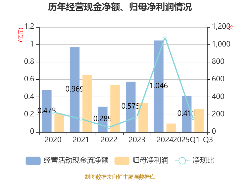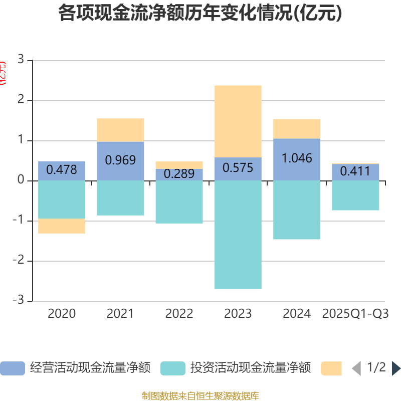 2025年前三季度,公司经营活动现金流净额为4107.05万元,同比下降12.18%;筹资活动现金流净额209.51万元,同比减少9008.09万元;投资活动现金流净额-7443.71万元,上年同期为-1.14亿元。