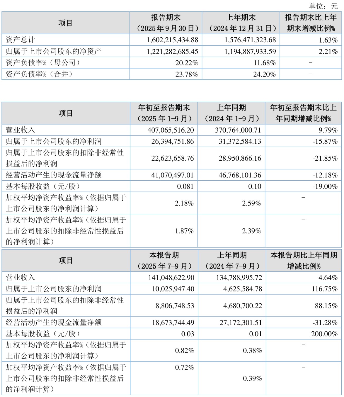 负债重大变化方面,截至2025年三季度末,公司应付票据及应付账款较上年末减少22.86%,占公司总资产比重下降1.4个百分点;短期借款较上年末增加18.15%,占公司总资产比重上升0.77个百分点;长期借款较上年末减少9.37%,占公司总资产比重下降0.61个百分点;其他应付款(含利息和股利)较上年末增加30.63%,占公司总资产比重上升0.41个百分点。