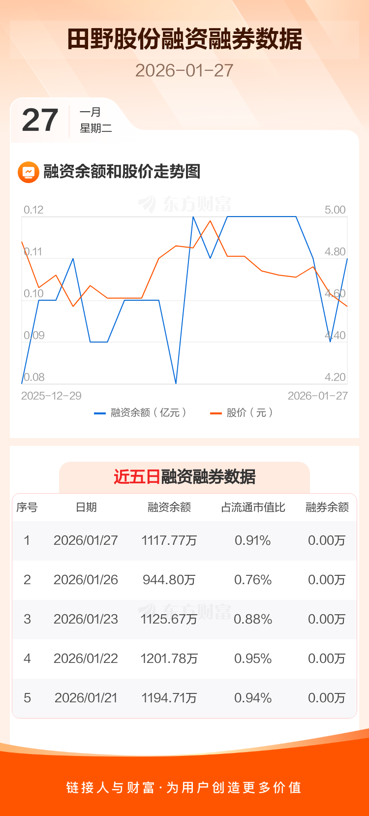 交易所最新数据显示,田野股份于2026年1月27日获融资买入174.75万元,融资偿还1.78万元,当日融资净买入172.97万元。目前,该股融资余额1117.77万,占流通市值比例为0.91%。