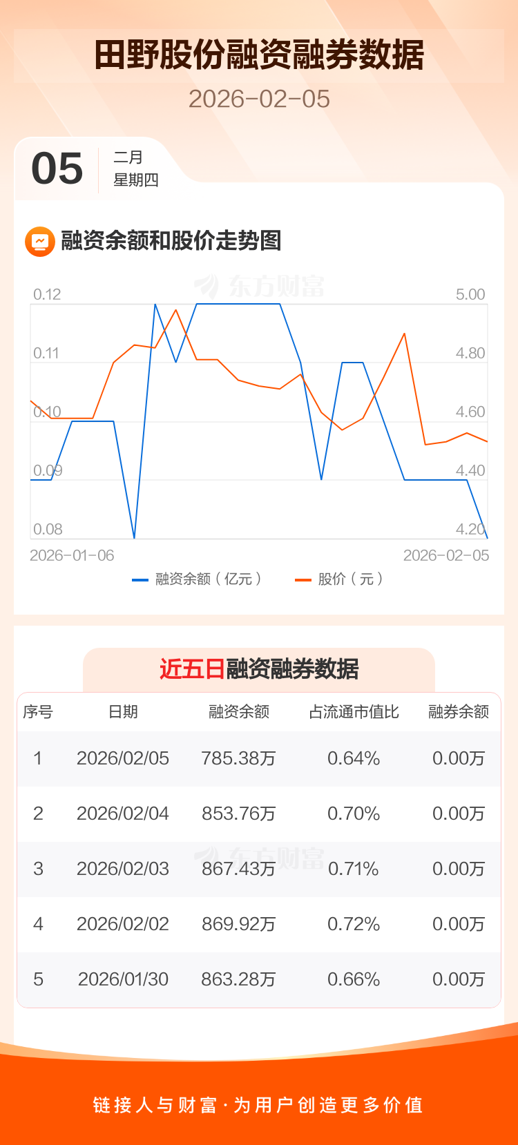 交易所最新数据显示,田野股份于2026年2月5日获融资买入2.20万元,融资偿还70.58万元,当日融资净偿还68.38万元。目前,该股融资余额785.38万,占流通市值比例为0.64%。