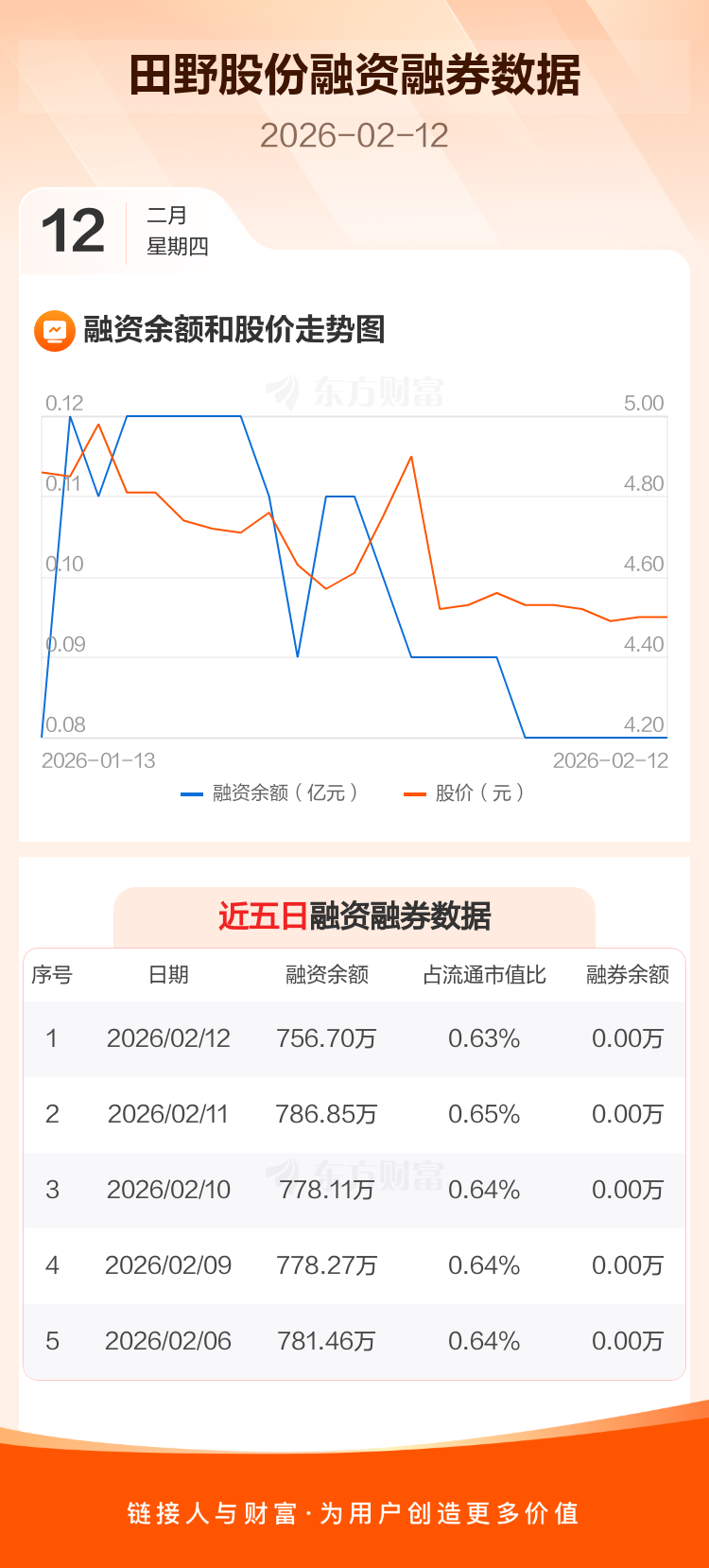 交易所最新数据显示,田野股份于2026年2月12日获融资买入5.88万元,融资偿还36.03万元,当日融资净偿还30.16万元。目前,该股融资余额756.70万,占流通市值比例为0.63%。