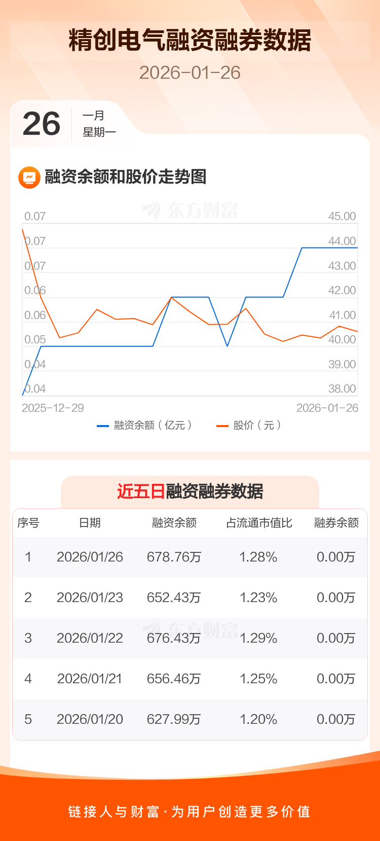 交易所最新数据显示,精创电气于2026年1月26日获融资买入92.48万元,融资偿还66.16万元,当日融资净买入26.32万元。目前,该股融资余额678.76万,占流通市值比例为1.28%。
