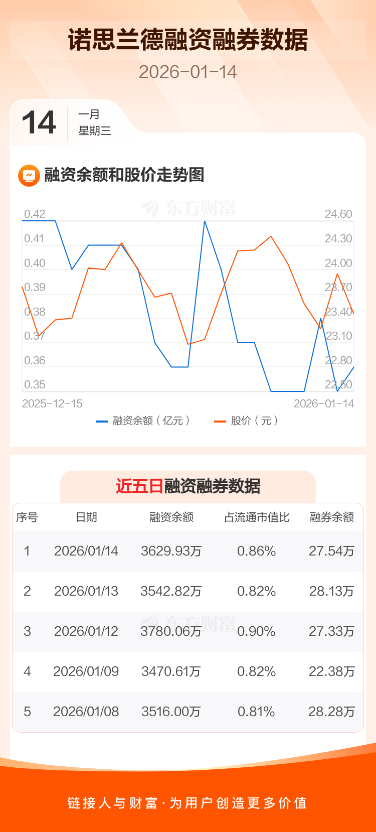交易所最新数据显示,诺思兰德于2026年1月14日获融资买入419.13万元,融资偿还332.02万元,当日融资净买入87.11万元。目前,该股融资余额3629.93万,占流通市值比例为0.86%。