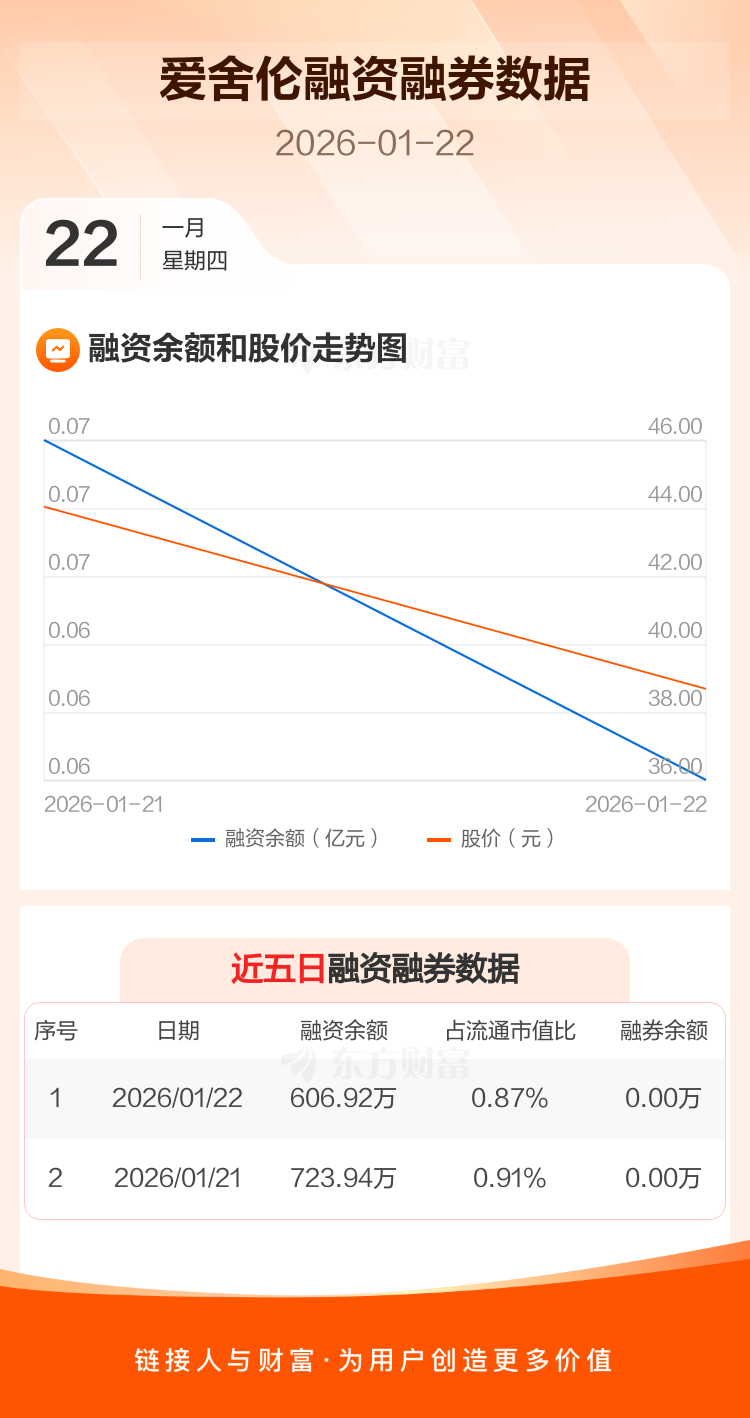 交易所最新数据显示,爱舍伦于2026年1月22日获融资买入521.98万元,融资偿还638.99万元,当日融资净偿还117.01万元。目前,该股融资余额606.92万,占流通市值比例为0.87%。
