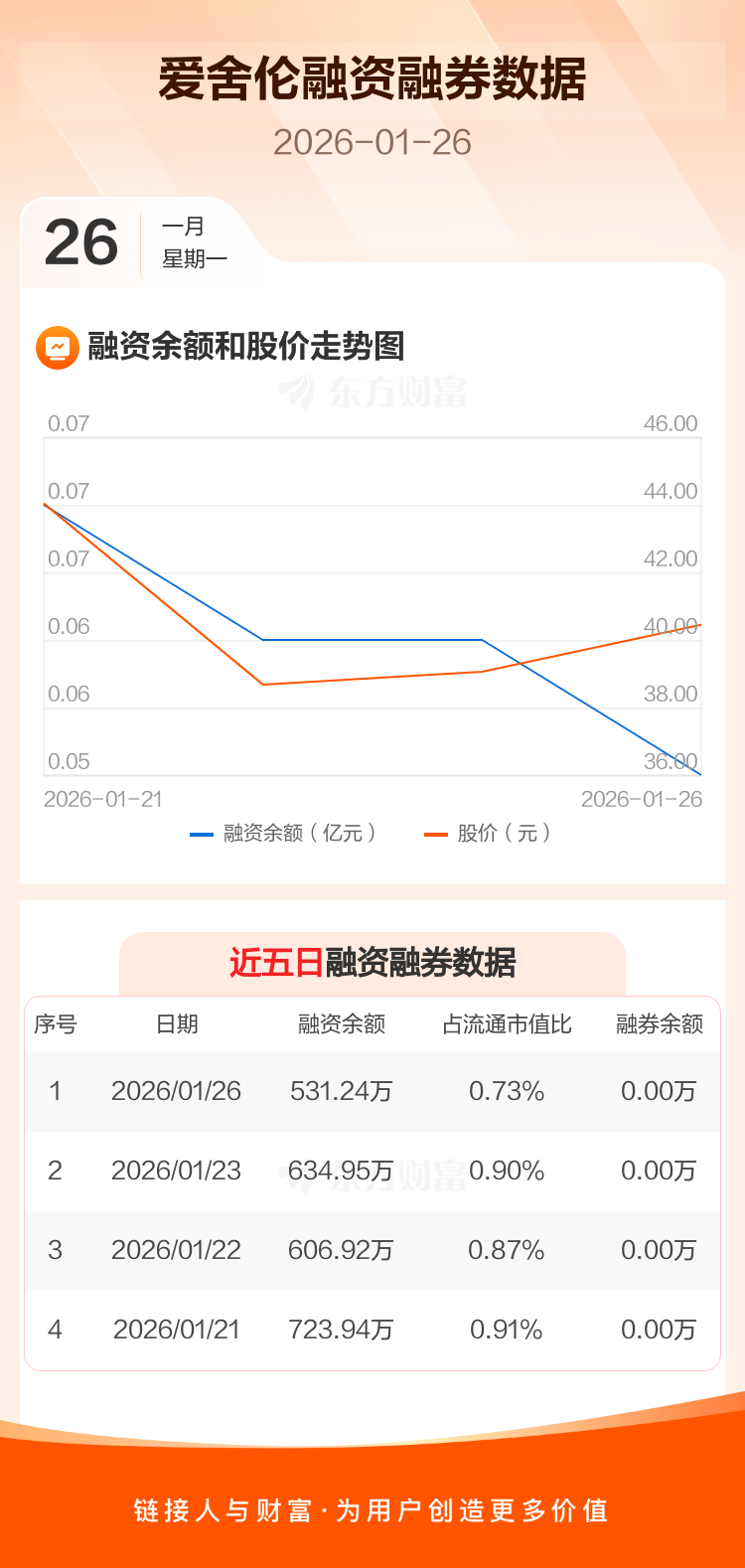 交易所最新数据显示,爱舍伦于2026年1月26日获融资买入152.56万元,融资偿还256.27万元,当日融资净偿还103.71万元。目前,该股融资余额531.24万,占流通市值比例为0.73%。