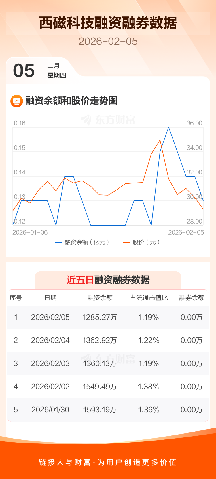 交易所最新数据显示,西磁科技于2026年2月5日获融资买入74.86万元,融资偿还152.51万元,当日融资净偿还77.65万元。目前,该股融资余额1285.27万,占流通市值比例为1.19%。