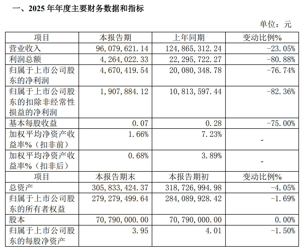 该公司披露的2025年三季报显示,去年前三季度公司实现营业总收入7373.84万元,同比下降22.69%;归母净利润319.73万元,同比下降81.94%;扣非净利润137.16万元,同比下降84.88%;经营活动产生的现金流量净额为925.64万元,同比下降49.85%。
