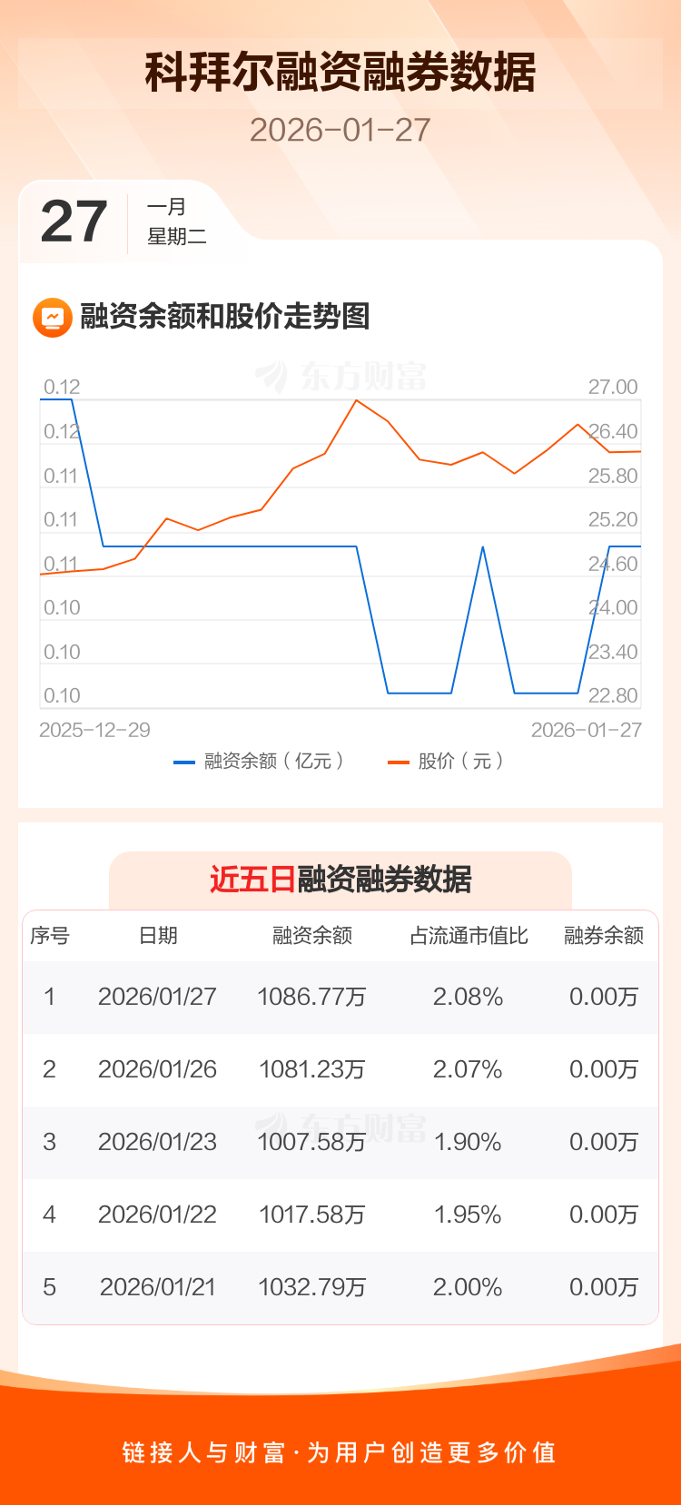 交易所最新数据显示,科拜尔于2026年1月27日获融资买入118.62万元,融资偿还113.08万元,当日融资净买入5.54万元。目前,该股融资余额1086.77万,占流通市值比例为2.08%。