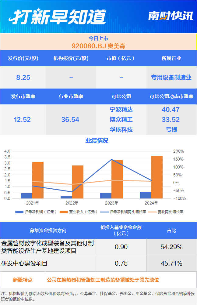 10月10日,有一只新股上市,为北交所的奥美森(920080.BJ)。该公司是专业的智能装备制造生产商,主要从事智能生产设备及生产线的研发、设计、生产、销售,公司产品可广泛应用于电器、环保、风电和锂电新能源及其他行业等领域,是实现生产自动化、智能化和高效化的关键装备。