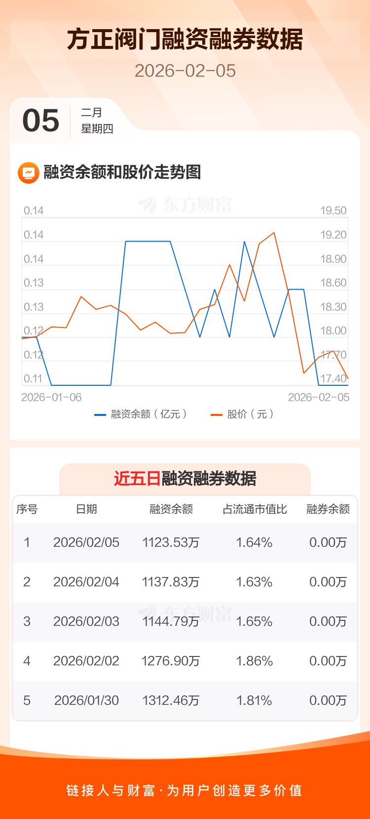 交易所最新数据显示,方正阀门于2026年2月5日获融资买入22.74万元,融资偿还37.05万元,当日融资净偿还14.31万元。目前,该股融资余额1123.53万,占流通市值比例为1.64%。