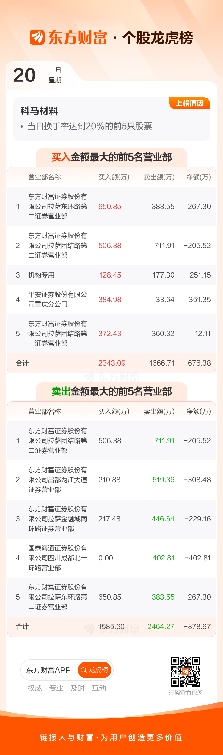 交易所2026年1月20日公布的交易公开信息显示,科马材料因成为当日换手率达到20%的前5只股票上榜。科马材料当日收报41.49元,涨跌幅3.08%,偏离值42.48%,换手率42.48%,成交额3.33亿。