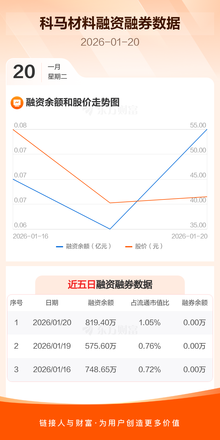 交易所最新数据显示,科马材料于2026年1月20日获融资买入455.16万元,融资偿还211.37万元,当日融资净买入243.79万元。目前,该股融资余额819.40万,占流通市值比例为1.05%。
