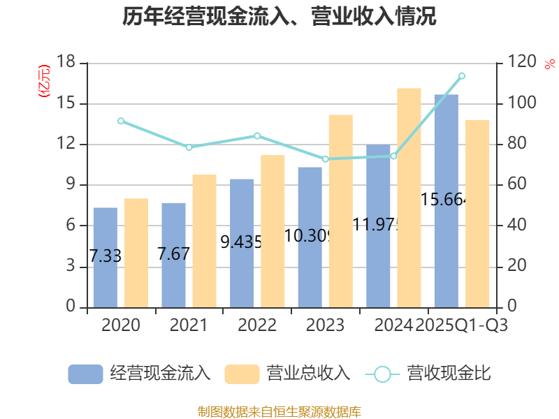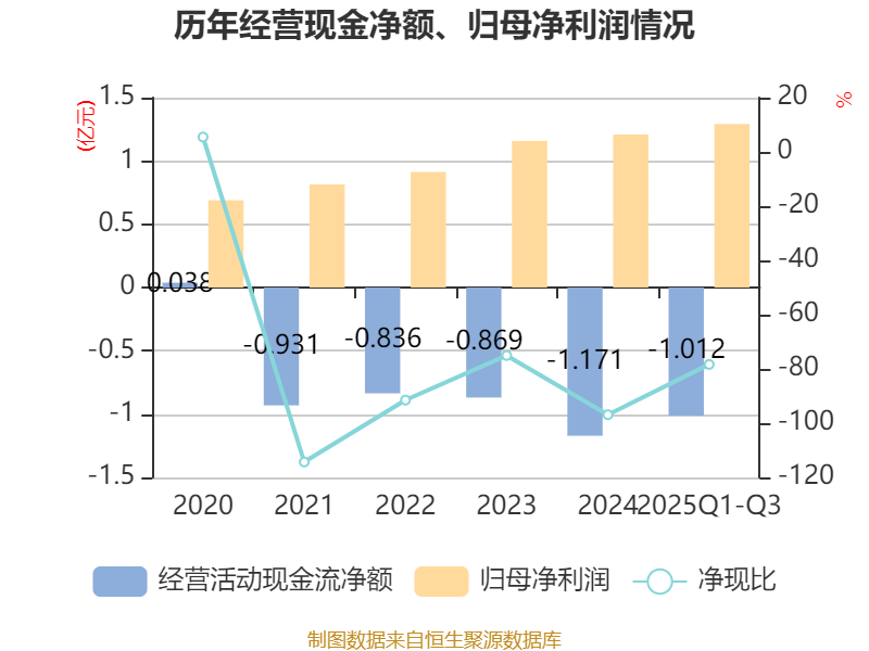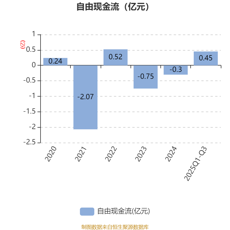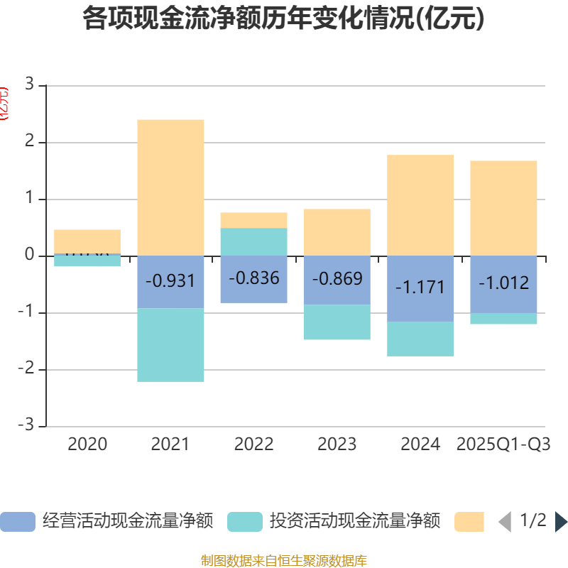 2025年前三季度,公司经营活动现金流净额为-1.01亿元,同比减少1332.02万元;筹资活动现金流净额1.67亿元,同比增加5472.41万元;投资活动现金流净额-1941.77万元,上年同期为-2032.99万元。