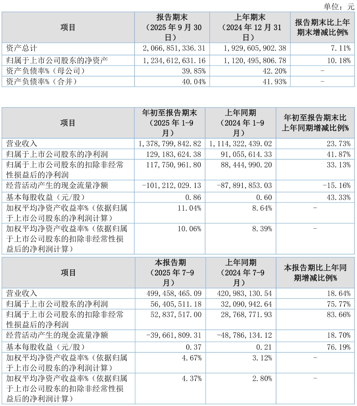 负债重大变化方面,截至2025年三季度末,公司应付票据及应付账款较上年末减少2.59%,占公司总资产比重下降2.55个百分点;短期借款较上年末增加39.96%,占公司总资产比重上升1.82个百分点;其他流动负债较上年末减少17%,占公司总资产比重下降1.22个百分点;长期借款较上年末减少58.55%,占公司总资产比重下降0.32个百分点。
