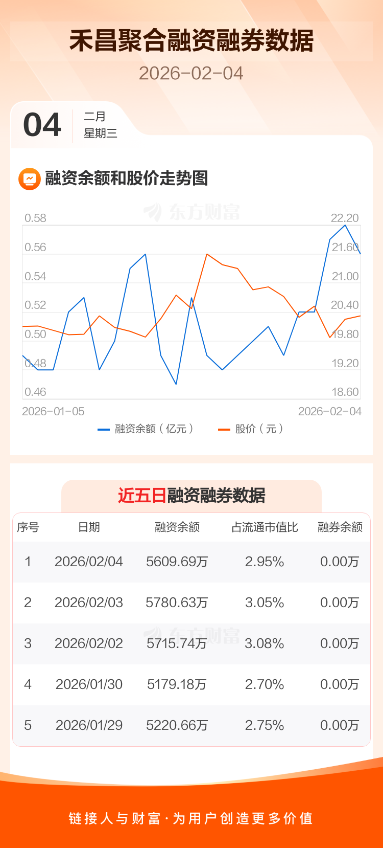 交易所最新数据显示,禾昌聚合于2026年2月4日获融资买入352.93万元,融资偿还523.87万元,当日融资净偿还170.94万元。目前,该股融资余额5609.69万,占流通市值比例为2.95%。