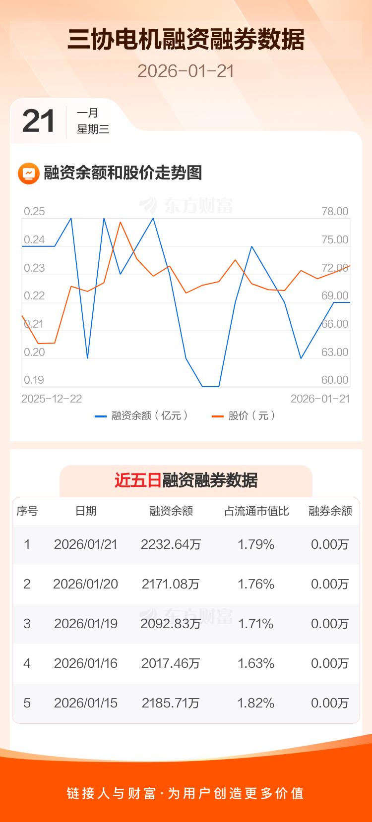 交易所最新数据显示,三协电机于2026年1月21日获融资买入456.74万元,融资偿还395.18万元,当日融资净买入61.56万元。目前,该股融资余额2232.64万,占流通市值比例为1.79%。