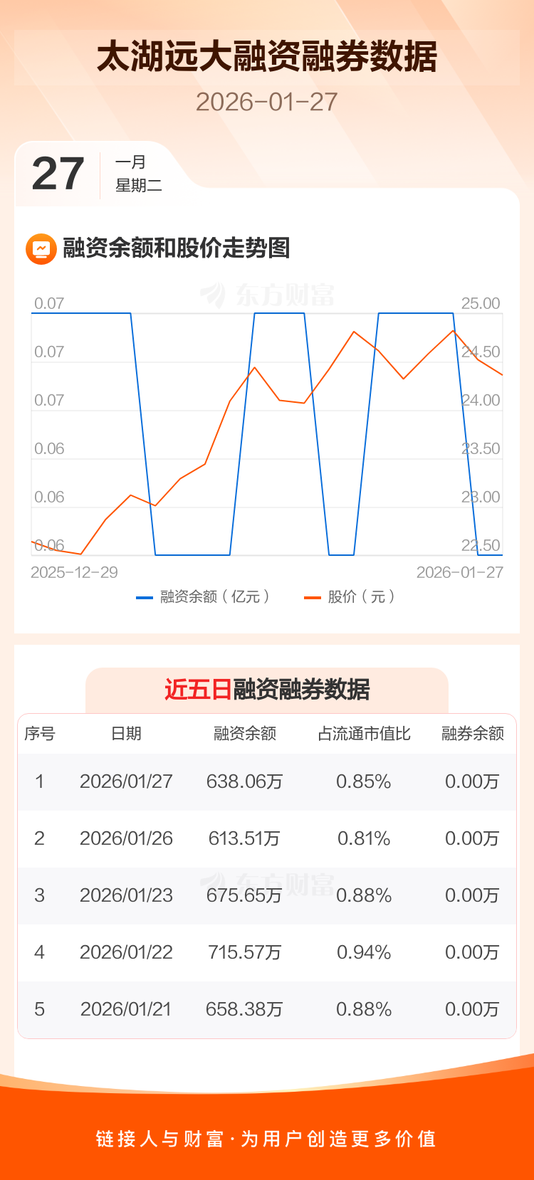 交易所最新数据显示,太湖远大于2026年1月27日获融资买入30.70万元,融资偿还6.15万元,当日融资净买入24.55万元。目前,该股融资余额638.06万,占流通市值比例为0.85%。