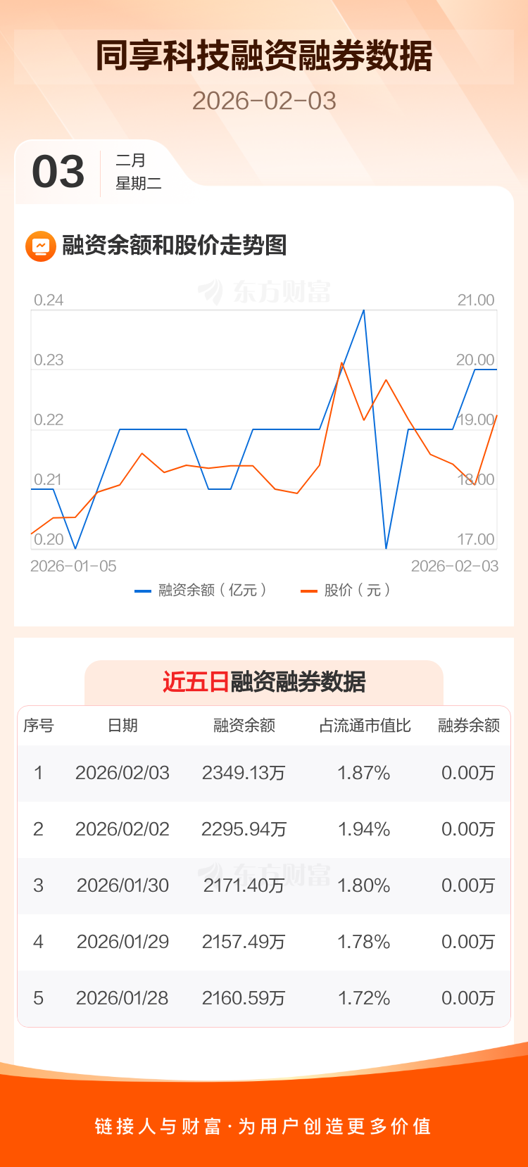 交易所最新数据显示,同享科技于2026年2月3日获融资买入346.93万元,融资偿还293.74万元,当日融资净买入53.19万元。目前,该股融资余额2349.13万,占流通市值比例为1.87%。