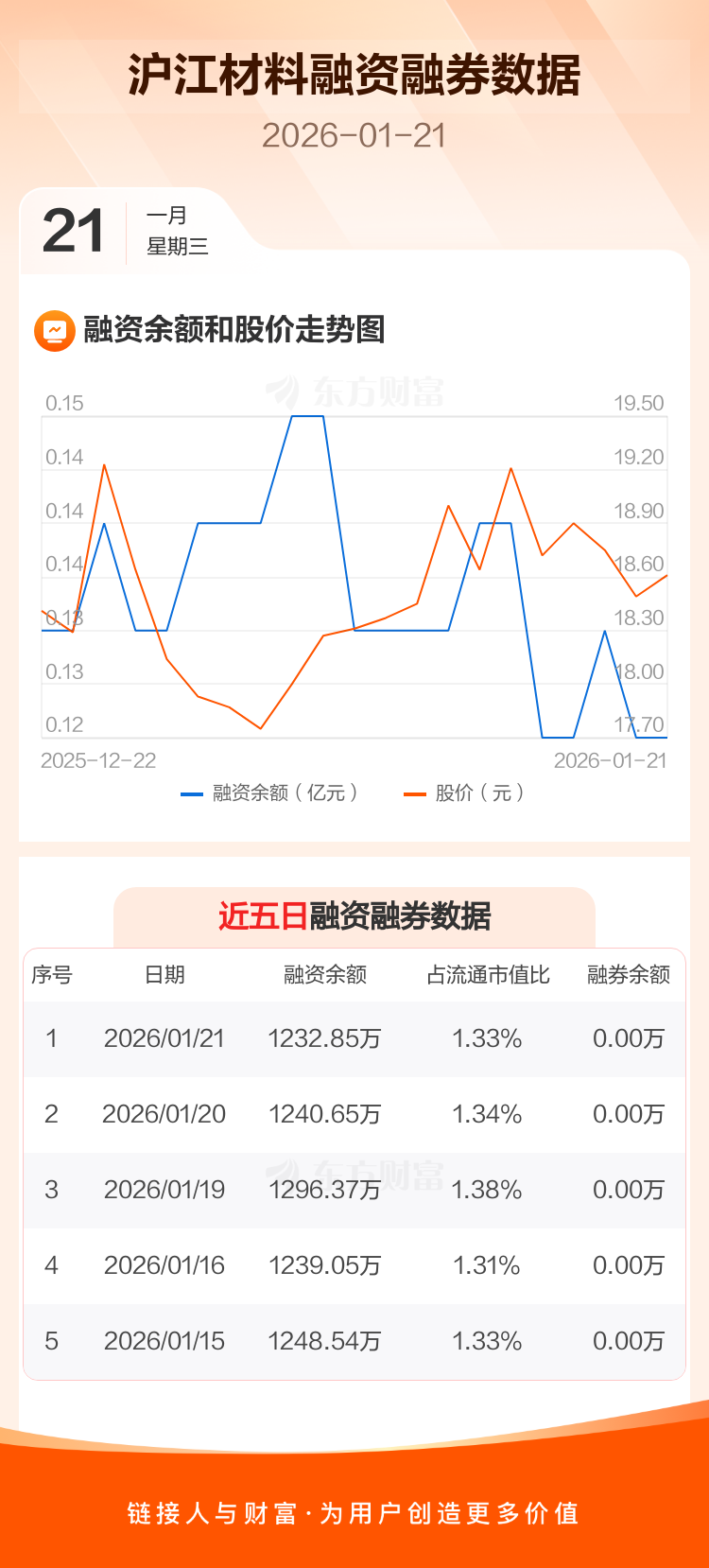 交易所最新数据显示,沪江材料于2026年1月21日获融资买入33.68万元,融资偿还41.48万元,当日融资净偿还7.8万元。目前,该股融资余额1232.85万,占流通市值比例为1.33%。