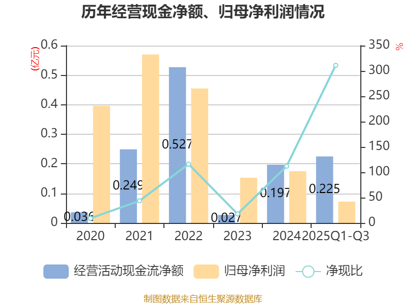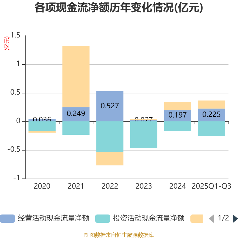 2025年前三季度,公司经营活动现金流净额为2252.01万元,同比增加5416.81万元;筹资活动现金流净额1408.7万元,同比减少3447.57万元;投资活动现金流净额-2526.87万元,上年同期为-1605.27万元。