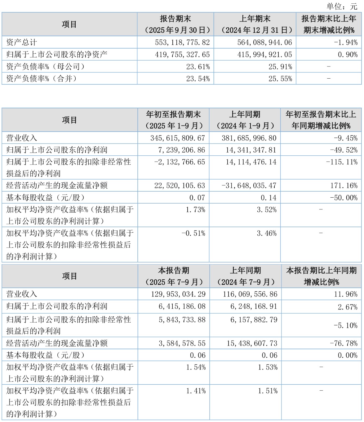 负债重大变化方面,截至2025年三季度末,公司短期借款较上年末减少39.78%,占公司总资产比重下降3.76个百分点;应付票据及应付账款较上年末增加16.16%,占公司总资产比重上升2.15个百分点;应付职工薪酬较上年末减少18.81%,占公司总资产比重下降0.28个百分点;一年内到期的非流动负债较上年末减少100%,占公司总资产比重下降0.09个百分点。