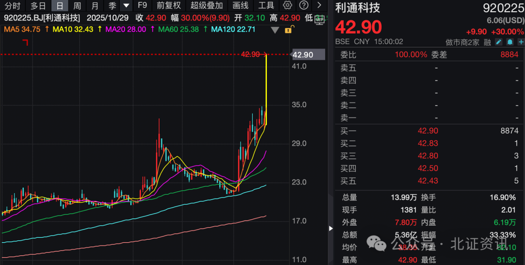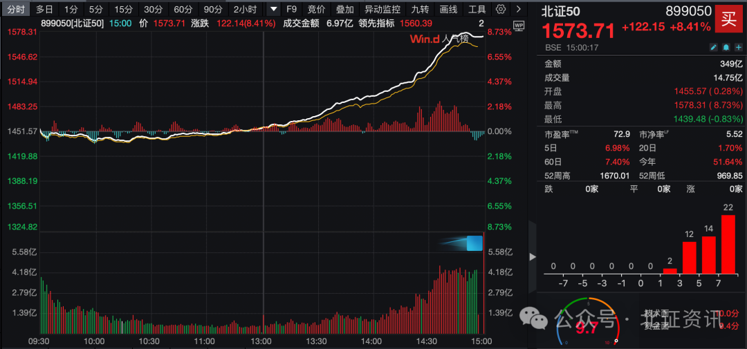 北交所又一次爆发了:北证50指数大涨8.41%,再次突破1500点大关,成交急增至349亿元。消息面上,北交所董事长鲁颂宾在10月29日的2025金融街论坛年会上表示,持续优化北交所指数体系建设,加快推出北证50ETF,研究引入盘后固定价格交易,不断提升投资交易便利性。