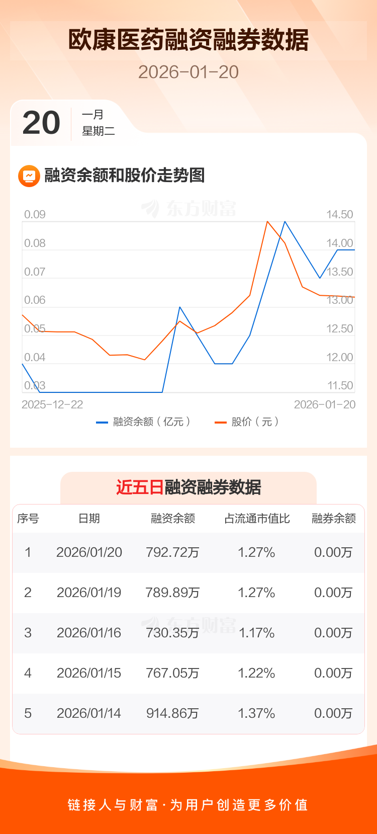 交易所最新数据显示,欧康医药于2026年1月20日获融资买入119.96万元,融资偿还117.13万元,当日融资净买入2.84万元。目前,该股融资余额792.72万,占流通市值比例为1.27%。